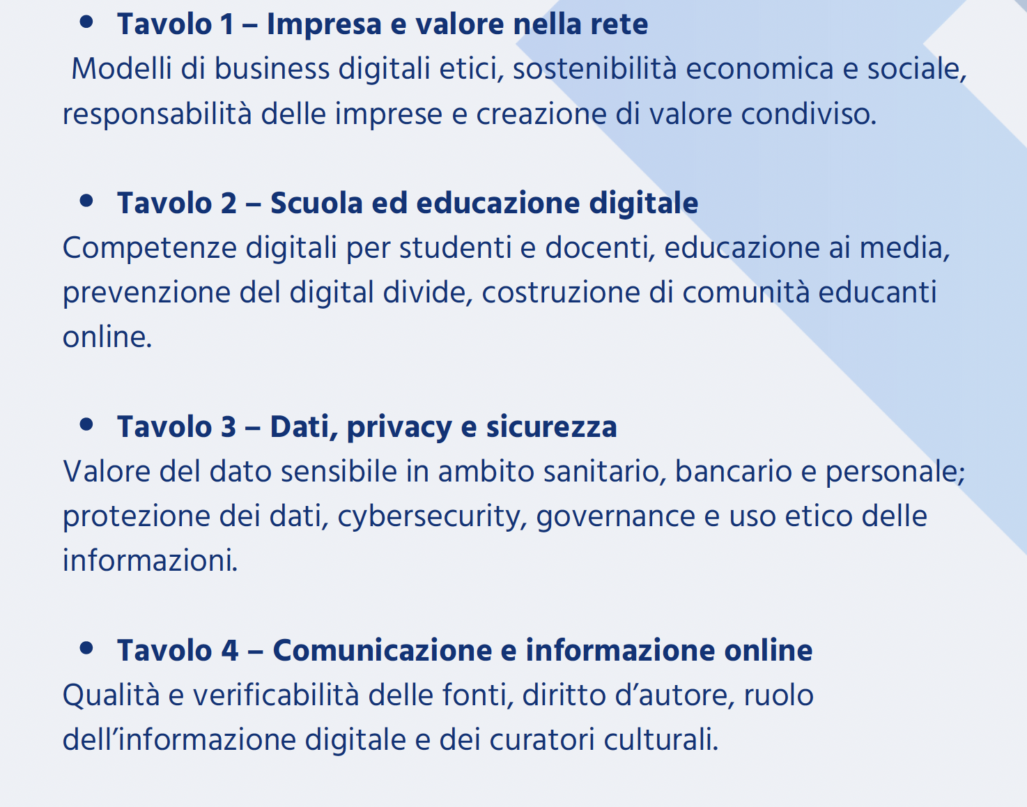 La scuola e il terzo settore sono il primo laboratorio di cittadinanza digitale. Il tavolo lavorerà su come rendere l’educazione digitale un bene comune, favorendo collaborazione tra studenti, docenti e cittadini.